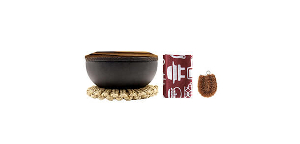 鍋にもうつわにもなる鉄の器 19cmに、木蓋、わら座、手ぬぐい、お手入れ用たわしを組み合わせたセット。鉄の器で調理したら、手ぬぐいで食卓へ。これひとつで一食が完結します。一人暮らしの自炊に、まずひとつ揃えるならこのセットから。鉄の器は、気負わず使えてきちんと美味しくしてくれる、頼れる調理道具です。
